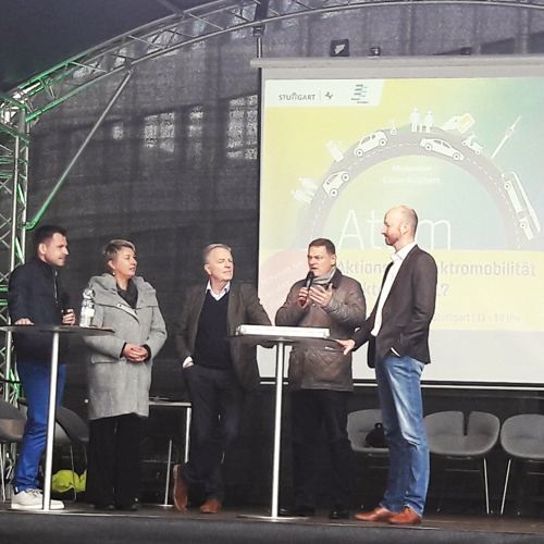 v.l. Moderator Kilian ReichertBürgermeister Dr. Martin Schairer, Landeshauptstadt StuttgartDr. Nicola Schelling, Regionaldirektorin Verband Region StuttgartFranz Loogen, Geschäftsführer e-mobil BW GmbHLars Walch, E-Mobilität Strategie & Partnerschaften, EnBW AG