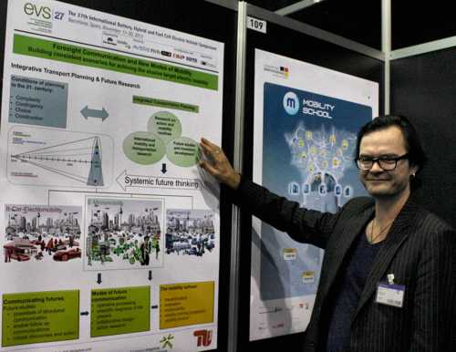 Das BSM-Projekt "Mobilitätsschule" wird von Ingo Kollosche von der TU Berlin bei der Dialogue Session vorgestellt (links). Ein weiteres Schaufenster-Projekt - 'PiVO - Netz-Optimiertes Laden im Smart Grid' wurde ebenfalls präsentiert. |