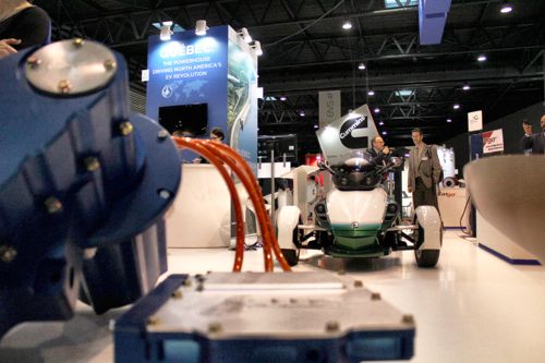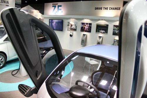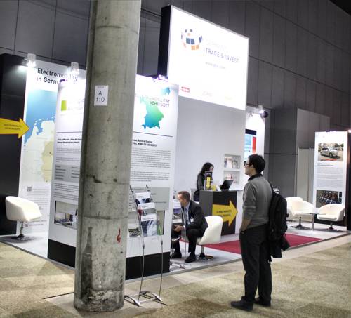Auf der Ausstellung beeindruckten besonders die Stände von Quebec (oben links) und Norwegen (oben rechts). Von den großen Herstellern waren Renault (ganz unten), Volkswagen (rechts) und BWM (unten links) gekommen. Der deutsche Stand der 'German Trade and Invest' präsentierte die vier 'Schaufenster Elektromobilität' (links). Auf dem AVERE-Stand konnten sich alle europäischen Verbände darstellen (rechts). Fotos: M. Breust |